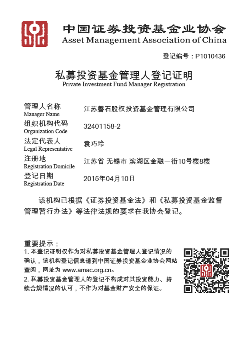 磐石基金于2015年4月通過中國證券投資基金業(yè)協(xié)會審核備案(備案編號:P1010436)登記成為私募投資基金管理人,是具備開展私募投資基金業(yè)務(wù)的金融機構(gòu)。
